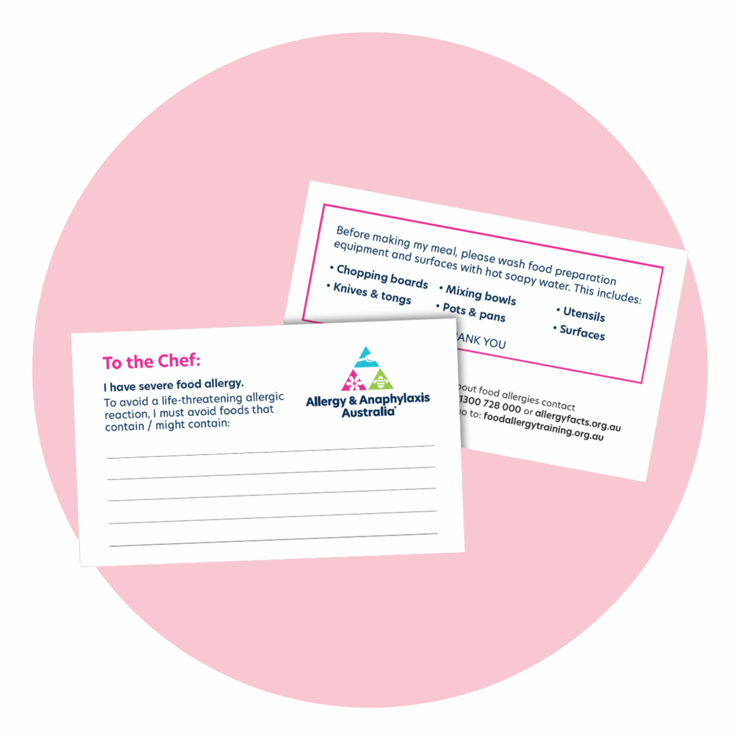 To make eating out a little easier, A&AA has developed a chef card. You can write or print your allergens on the card. When telling the wait staff at a cafe or restaurant about your allergies, hand over your chef card and ask it to come back with your specially prepared meal.