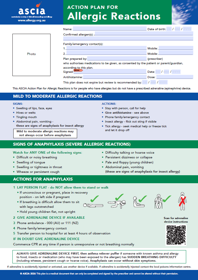 The ASCIA Action Plan for Allergic Reactions is for people with food allergy who have not been prescribed an adrenaline device because their allergic reaction, so far, has not been severe.